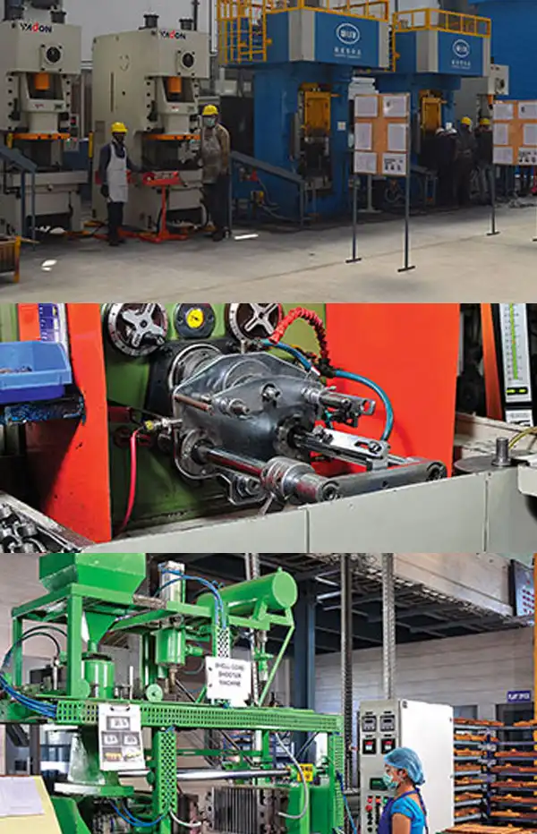 Spread across three production plants in an area of over 29,000 sq. mtr., manufacturing facilities of GPP Group are equipped with state-of-the-art machineries and equipment for Hot Forging, Projection Welding, Induction Hardening, Gas Carburising, Hardening & Tempering, Centerless Grinding, Super Finishing, Precision Machining, CNC controlled SPM, Spring end Grinding, Shot Peening, CNC Spring Coiling, Forming Machine & Inhouse Foundry etc.