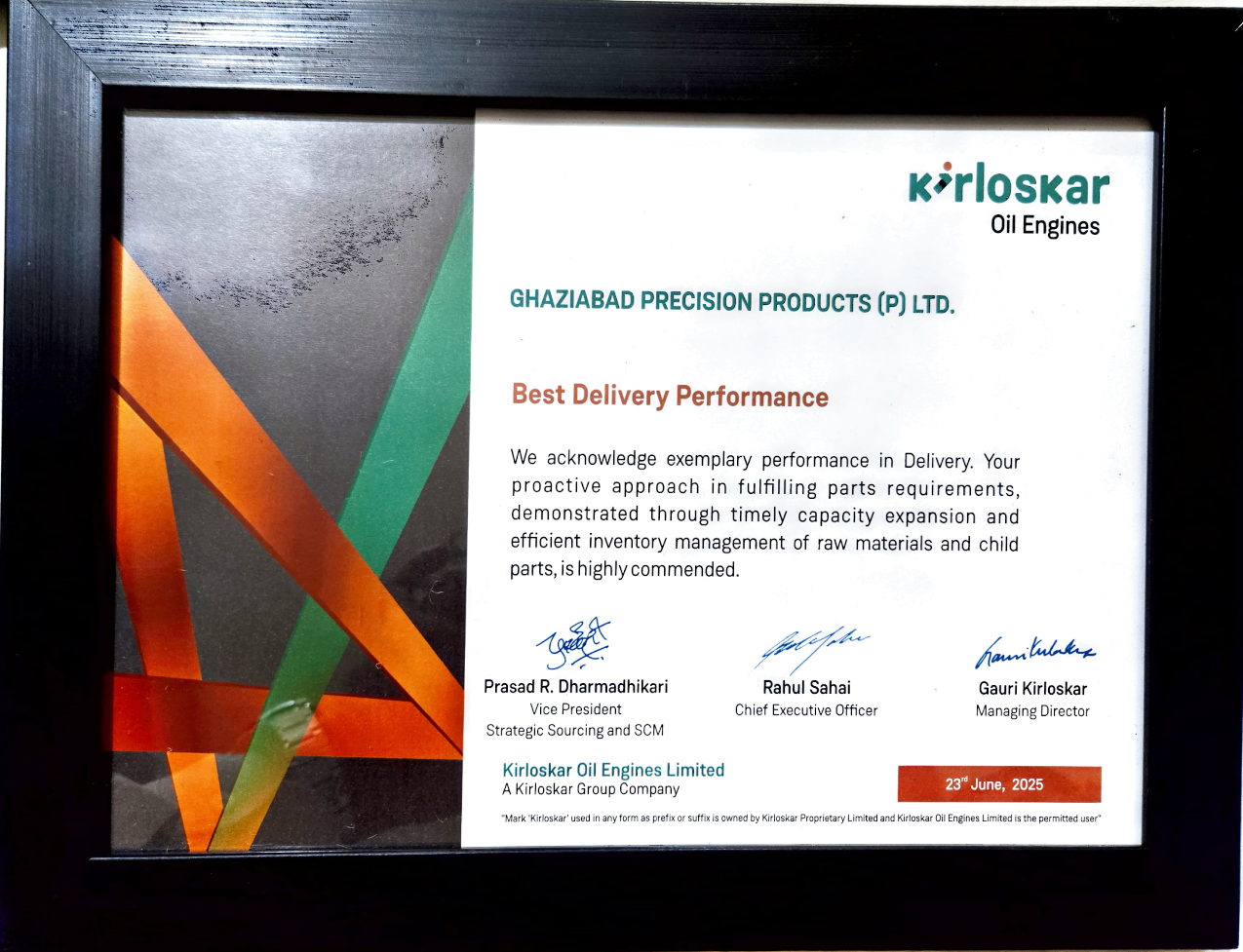 Koel acknowledge exemplary performance in delivery . Our proactive approach in fulfilling parts requirement, demonstrated through timely capacity expansion and efficient inventory management of raw materials and child parts, is highly commended.